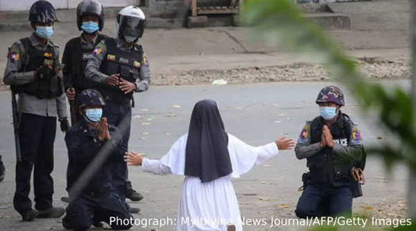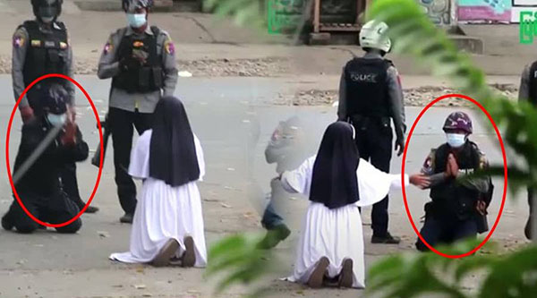 மியான்மரில் போ.ரா.ட்.ட.க்.கா.ரர்களை விட்டு விடும்படி கூறி, கன்னியாஸ்திரி ஒருவர் பொ.லி.சார் மு.ன் ம.ண்.டி.யி.ட்ட வீடியோ சமூகவலைத்தளங்களில் அதிக அளவில் ப.கி.ரப்பட்டு வருகிறது.
