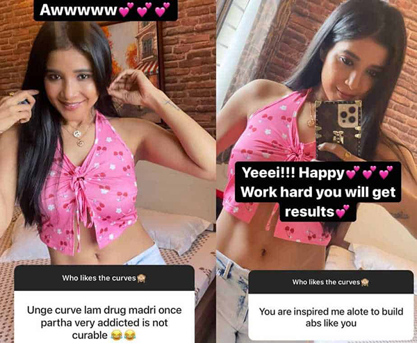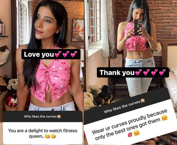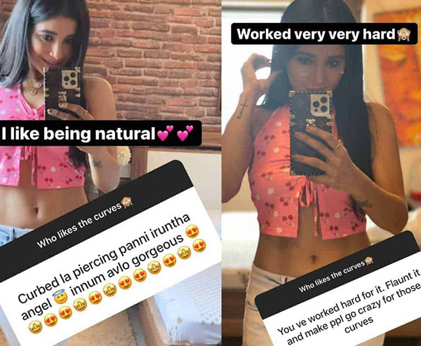 இந்நிலையில், யாரெல்லாம் என்னோட வளைவு, நெழிவுகளை விரும்புறீங்க..? என்று கேள்வி எழுப்பியுள்ளார் அம்மணி. இதனை பார்த்த ரசிகர்களும், கண்டபடி வர்ணிக்க அவர்களுக்கு நன்றி.. ஐ லவ் யூ என விதவிதமாக பதிலளித்து வருகிறார் அம்மணி.