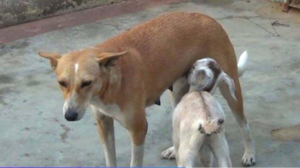 தாய் ஆடு இல்லாமல் தவித்த ஆட்டுக்குட்டிக்கு துரைச்சாமி வளர்க்கும் நாயே தாயாக மாறி, ஆட்டுக்குட்டிக்கு தினமும் பாலூட்டி வளர்த்து வருகிறது. இச்சம்பவத்தை பார்த்த எழுத்தாளர் சோளச்சி என்பவர் வீடியோ எடுத்து அதை தனது வளைதளப்பக்கத்தில் பதிவிட்டுள்ளார். இந்த வீடியோ தற்போது இணையத்தில் வைரலாகி வருகிறது.