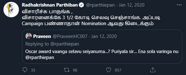 இதற்கு முன்னர் தமிழ் சினிமாவில் இருந்து நடிகர் பார்த்திபன் தன்னுடைய ஒத்த செருப்பு படத்தை ஆஸ்கார் விருதுக்கு அனுப்பினார். அவரிடம் ரசிகர் ஒருவர் ஆஸ்கார் விருதுக்கு எப்படி அனுப்புவது போன்ற கேள்வியைக் கேட்டுள்ளார். அதற்கு பணம் கொடுக்காமல் ஒன்றும் வேலைக்கு ஆகாது எனும் அளவுக்கு ஒரு பதிலைக் கூறி உள்ளார் பார்த்திபன்.