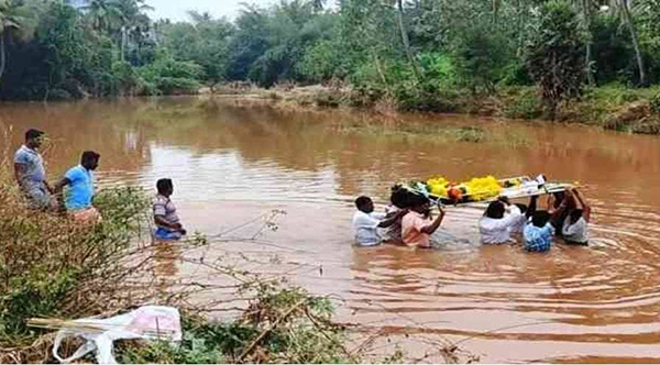 இடுப்பளவு தண்ணீரில் பூ த உ ட லை ம யா னத்துக்கு எடுத்து சென்ற கிராம மக்கள்….! காரணம் என்ன தெரியுமா ??