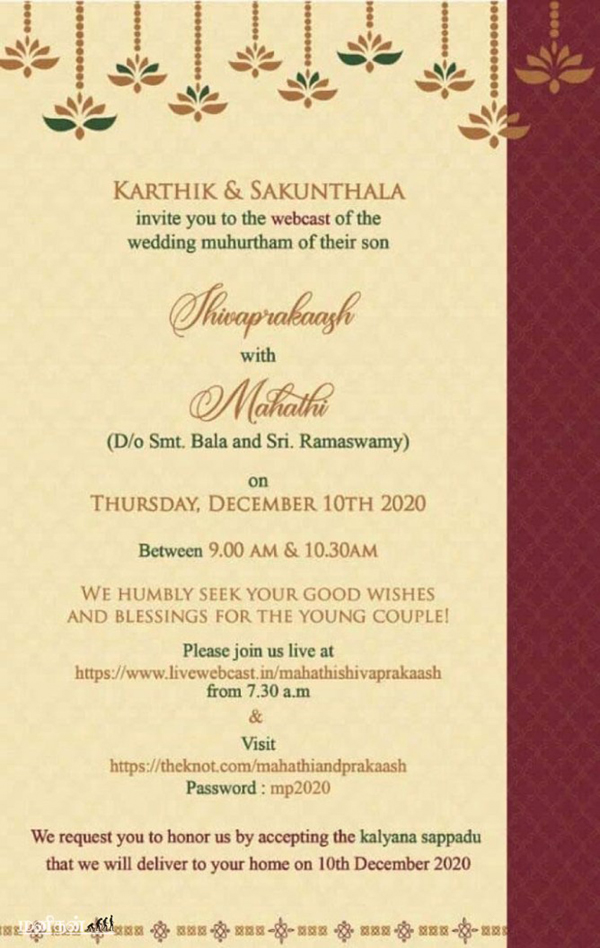 நாளை காலை 9 மணியில் இருந்து 10 மணிக்குள் அவர்களது திருமணம் நடக்கவிருக்கும் நிலையில், வாழ்த்த விரும்புவோர் அனைவரும் நேரலையில் கலந்து கொண்டு தங்களை ஆசீர்வதிக்க வேண்டும் என அந்த ஐடிக்கான பாஸ்வோர்டுடன் அழைப்பிதழில் குறிப்பிட்டுள்ளனர்.