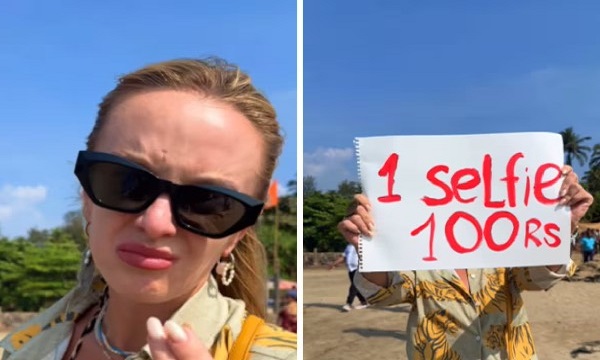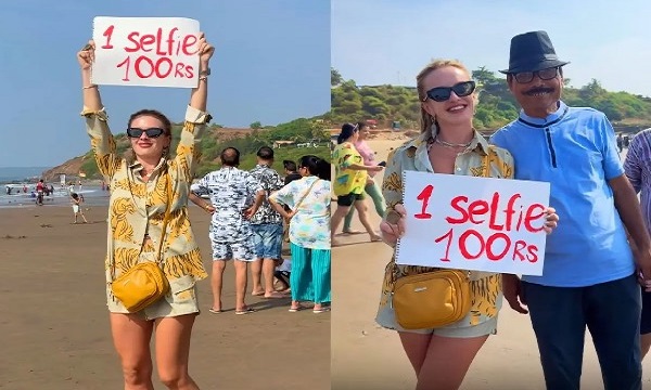 வீடியோவில், அவர் “1 செல்ஃபி – ₹100” என்று எழுதப்பட்ட ஒரு அடையாளத்தை பிடித்துக் கொண்டிருப்பதை பார்க்கலாம், அதே நேரத்தில் ஆர்வமுள்ள உள்ளூர்வாசிகள் அவரை புகைப்படம் எடுக்க வரிசையில் காத்திருப்பதை பார்க்க முடிகிறது.