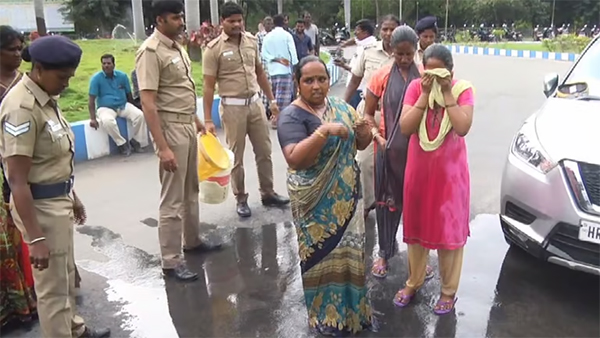 அப்போது பார்வதி தான் கொண்டு வந்த மண்ணெண்ணெய்யை தன் மீதும், தன் அருகில் நின்று கொண்டிருந்த இரண்டு மகள்கள் மீதும் ஊற்றி தற்கொலைக்கு முயன்றுள்ளார். இதனைப் பார்த்த போலீசார் விரைந்து சென்று தடுத்து நிறுத்தி மூவரையும் காப்பாற்றியுள்ளனர்.