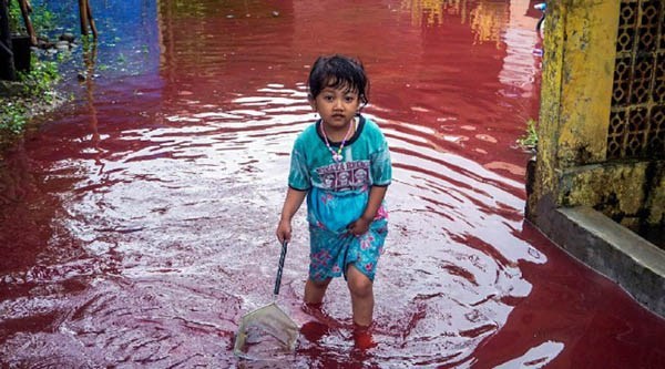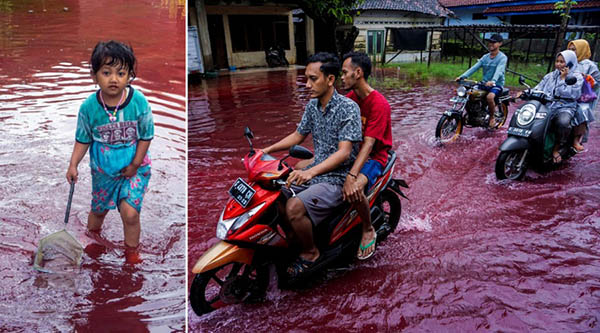 இந்தோனிஷியாவில் கிராமம் ஒன்று இரத்த சிவப்பு நிற வெள்ளத்தில் மூழ்கியிருக்கும் புடைப்படங்கள் சமூக வலைதளங்களில் வெளியாகி திகிலடைய வைத்துள்து.