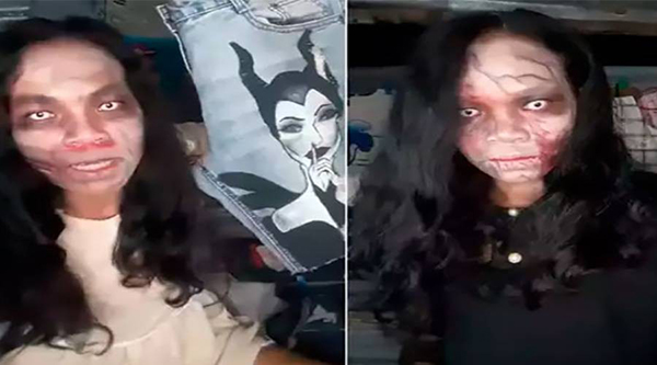 இறந்தவர்களின் உடையை விறபனை செய்ய பெண் ஒருவர் ஜாம்பி மேக்கப் மற்றும் உடையணிந்துகொண்டு கலக்கி வருகிறார்.