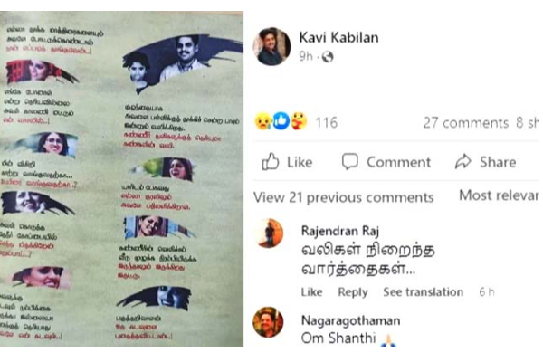 பிரபல தமிழ் திரைப்பட பாடலாசிரியர் கபிலனின் மகள் தூரிகை சில தினங்களுக்கு முன்பு தூக்கிட்டு தற்கொலை செய்து கொண்ட நிலையில் மகளை நினைத்து கவிலன் வெளியிட்டுள்ள கவிதை அனைவரையும் கண்கலங்க வைத்துள்ளது.