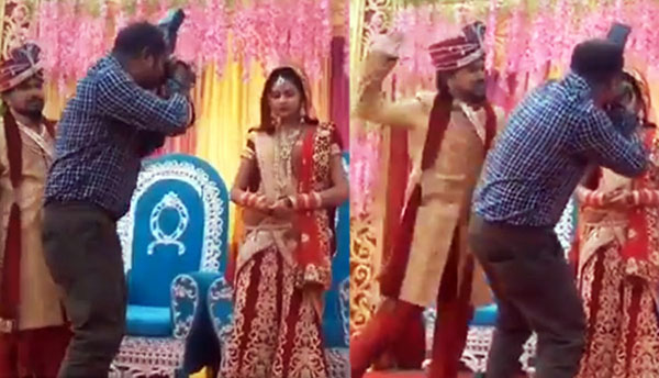 மணமேடையில், மாப்பிள்ளையை ச ற் று தள்ளி நிற்குமாறு கூறிய, போட்டோகிராபர், மணப்பெண்ணை சுற்றி சுற்றி புகைப்படம் எடுத்தார். இதனை அருகிலிருந்து பார்த்துக்கொண்டிருந்த மாப்பிள்ளை சிறுது நேரத்தில் டென்ஷன் ஆனார். இதை தொடர்ந்து, போ ட் டோகிராபரின் மண்டையில் ஒரு அ.டி.க்.கொ.டுத்த மாப்பிளையை கண்டு, ம ண ப்பெண் கு லு ங்கி கு லு ங்கி சிரித்தார்.