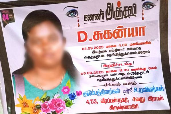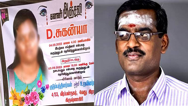 அதன்படி, கிருஷ்ணகிரி நீதிமன்றத்தில் இவர்களது விவாகரத்து மனு தாக்கல் செய்யப்பட்டு நிலுவையில் உள்ளது. இந்நிலையில், கடந்த 4ஆம் திகதி ருஷ்ணகிரி நகர் ஆர்.சி. சர்ச் மற்றும் வேறு சில இடங்களில் சுகன்யா இறந்துவிட்டதாக கண்ணீர் அஞ்சலி போஸ்டர் ஒட்டப்பட்டிருந்தது.