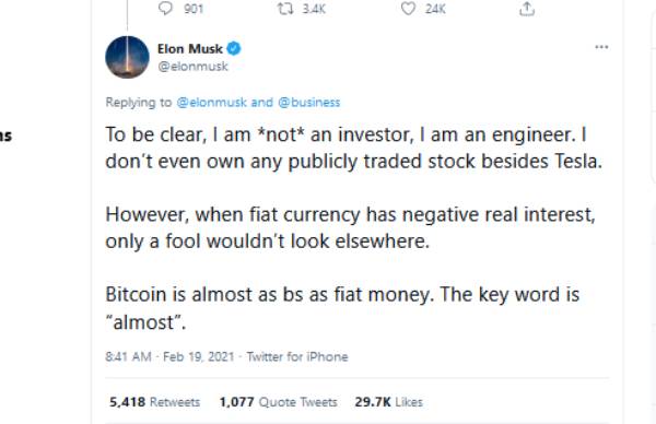எலான் மஸ்க் சமீபத்தில், ‘பணத்தை விட பிட்காயினே மேல்’ என தனது டுவிட்டர் பக்கத்தில் பதிவிட்டிருந்தார். இந்த ஒரு டுவீட் தான் டெஸ்லா நிறுவனத்தின் பங்குகள் வீ.ழ்.ச்.சி.ய.டைவதற்கு காரணம் எனக் கூறப்படுகிறது.