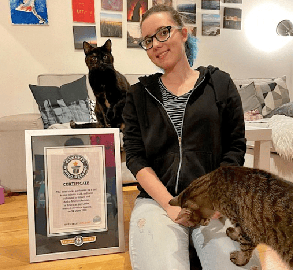 ஆஸ்திரியா நாட்டில் Anika Moritz (20) என்பவருக்குச் சொந்தமான Alexis என்ற பெண் பூனை ஒரு நிமிடத்தில் அதிக தந்திரங்களை (Tricks) நிகழ்த்தி கின்னஸ் சாதனையை முறியடித்தது .