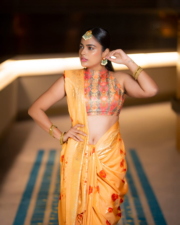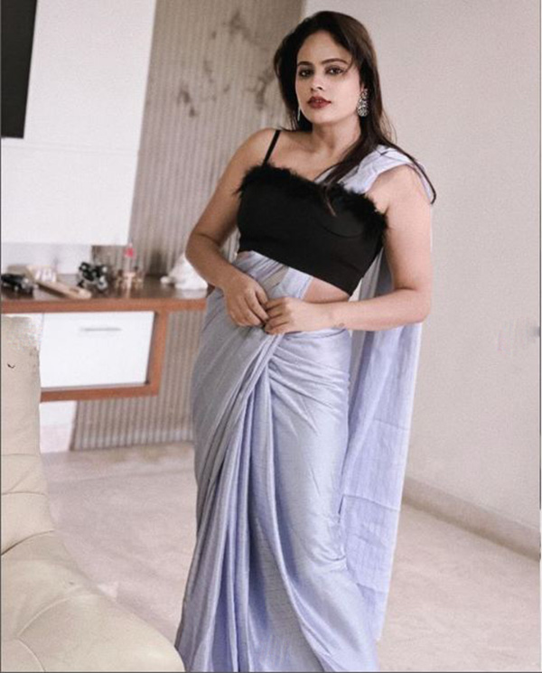 இதை தொடர்ந்து, தற்போது தன்னுடைய புடவை மேலே ப்ரா அணிந்திருப்பது போன்று வித்தியாசமான ஐடியாவில் விவகாரமான போஸ் கொடுத்து ரசிகர்களின் கவனத்தை சுண்டி இழுத்துள்ளார்.