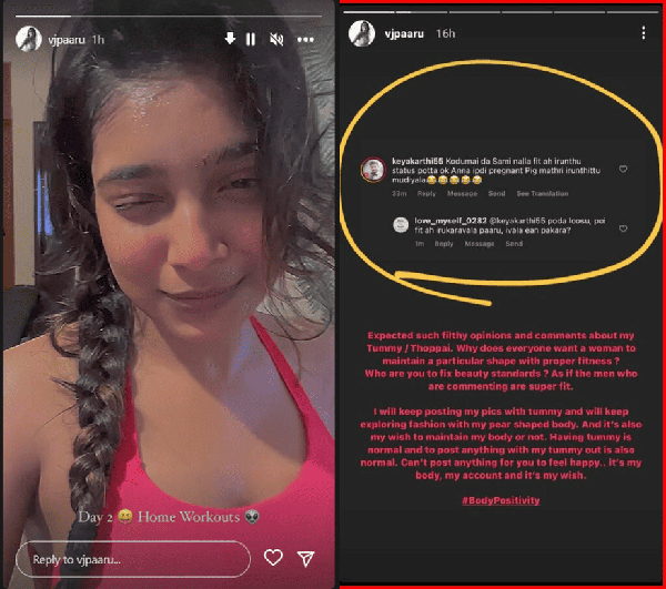 இந்தநிலையில், Vj பார்வதி தனக்கு வரும் மோசமான கமெண்டுக்கு பதிலளித்து வீடியோ ஒன்றை வெளியிட்டுள்ளார். ஒருவர் உடல் அமைப்பை கேலி செய்து கமெண்ட் செய்து இருக்கிறார்.