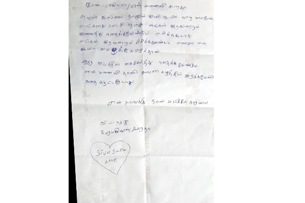 மேலும், ஒரு ஹார்ட் வரைந்து அதில் ‘சிவா சாரா லவ்’ என அந்தக் க.டி.தத்தில் எழுதப்பட்டிருந்தது. ம.னை.வி இ.ற.ந்த து.க்.கம் தாளாமல் க.ண.வன் தூ.க்.கு.ப்போ.ட்.டு த.ற்.கொ.லை செ.ய்.து.கொ.ண்.ட ச.ம்.பவம் சுசீந்திரம் பகுதியில் சோ.க.த்தை ஏ.ற்.படுத்தியது.