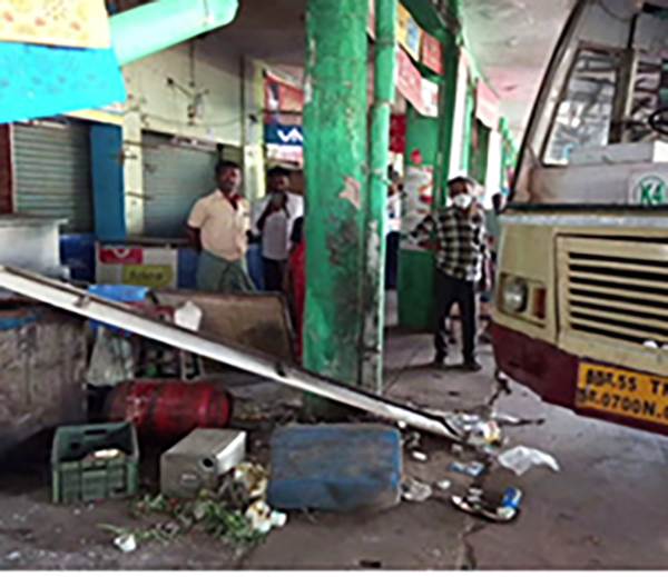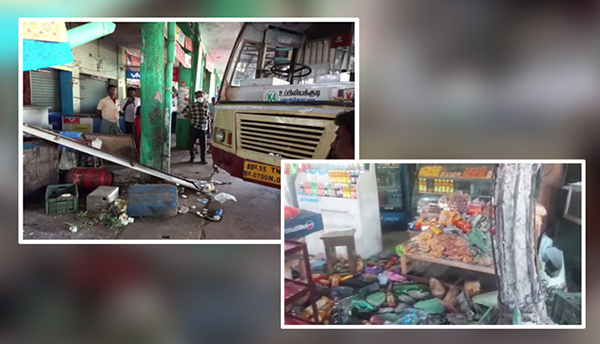 பிரேக் பிடிக்காமல் தடுப்புச் சுவரைத் தாண்டி எதிரே இருந்த கடைக்குள் புகுந்தது.
