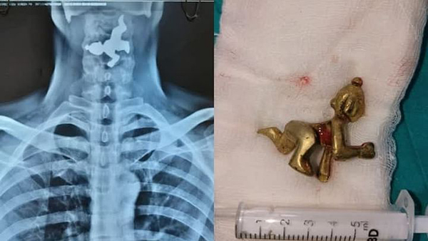 அவரை பரிசோதனை செய்ததில், தொண்டையில் பொருள் இருப்பது கண்டுபிடிக்கப்பட்டு, சிகிச்சை மூலம் வெளியே எடுக்கப்பட்டது.