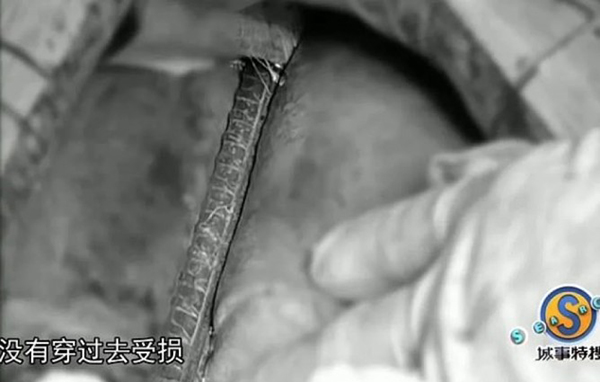 அந்த கம்பி Xiangஇன் பிட்டம் வழியாக நுழைந்து, அவரது தோள் வழியாக வெளியே நீட்டிக்கொண்டிருந்தது.