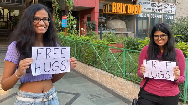 பெங்களூருவில் உள்ள தனியார் கல்லூரி ஒன்றில் படித்து அபூர்வ அகர்வால் (வயது 19) மற்றும் தனிஷா பரஸ்ராம்கா (22) என்ற இவர்கள் சர்ச் தெருவில், கைகளில் ‘ப்ரீ ஹக்ஸ்’ என்ற ஒரு பதாகை ஏந்தியபடி நின்று வருகின்றனர்.