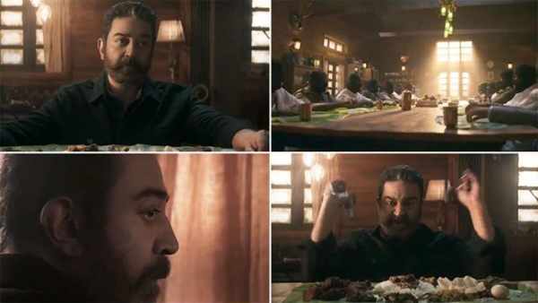 Teaser-இல் ஒரு தனி வீட்டில் இருக்கும் கமல்ஹாசன், கேங்ஸ்டர்ஸ் மற்றும் போலீஸ்காரர்களை அழைத்து விருந்து வைக்கிறார். இவர்கள் வருவதற்கு முன்பு பல்வேறு ஆயுதங்களை ஆங்காங்கே மறைத்து வைக்கிறார்.