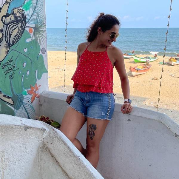 தற்போது பூஜை ராமச்சந்திரன் ஸ்லீவ் லஸ் டாப்புடன் குட்டி டவுசரில் தொடையில் இருக்கும் டாட்டூ தெரிய போஸ் கொடுத்துள்ளார்.