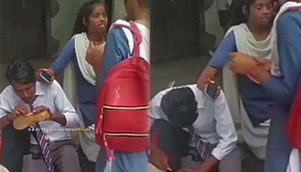 பெண் ஒருவரை கவர்வதற்கு இளைஞர் ஒருவர் அவரது ஷுவை கையில் எடுத்து பசை வைத்து ஒட்டும் காட்சி இணையத்தில் வைரலாகி வருகின்றது.