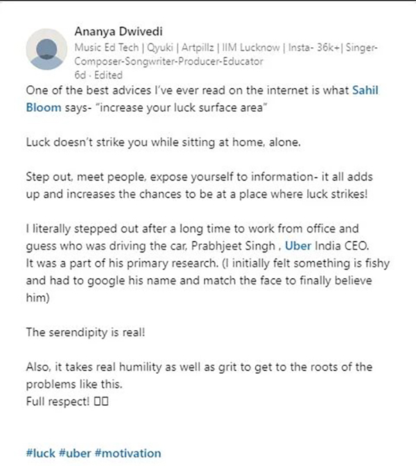 பிரபல சமூக வலைத் தளமான LinkedIn-ல் தனது வாழ்வில் நடந்த சுவாரஸ்யமான சம்பவத்தை பகிர்ந்து இருக்கிறார் அனன்யா திவேதி என்னும் இளம்பெண். தன்னுடைய அலுவலக வேலை காரணமாக ஊபர் புக் செய்து இருந்த அனன்யா, அதற்காக காத்திருந்து இருக்கிறார்.