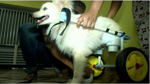 கால்களை இ ழ ந்த நாய்க்கு சக்கர நாற்காலி தயாரித்த உரிமையாளர்…!!