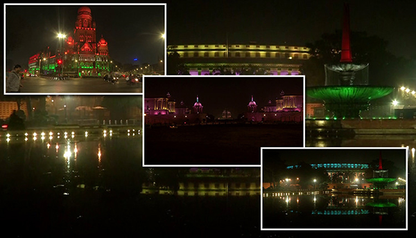 டெல்லியில் கு.டி.ய.ர.சுத் தலைவர் மாளிகை, இந்தியா கேட் உள்ளிட்ட இடங்களும், மின்விளக்குகளால் மூவர்ணக் கொடியை காட்சிப்படுத்தின.