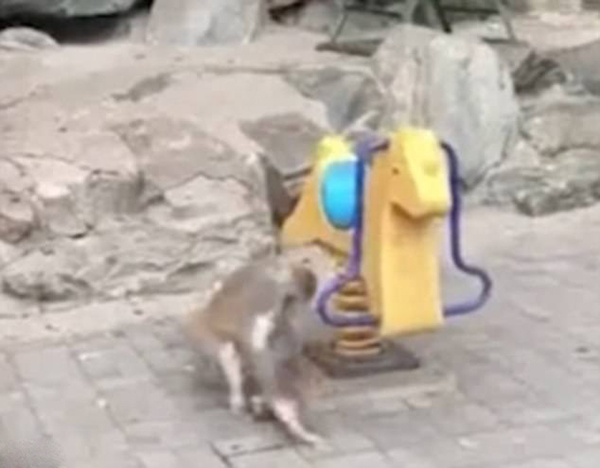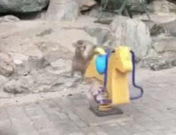 வனவிலங்கு காப்பகத்தில் இருந்த விளையாட்டு குதிரை மேல் ஏ றி வி ளையாடிய கு ட்டி குரங்கை தடுக்க அந்த குதிரையின் மீது ஏறி பலமாக ஆட்டியது தாய் குரங்கு.