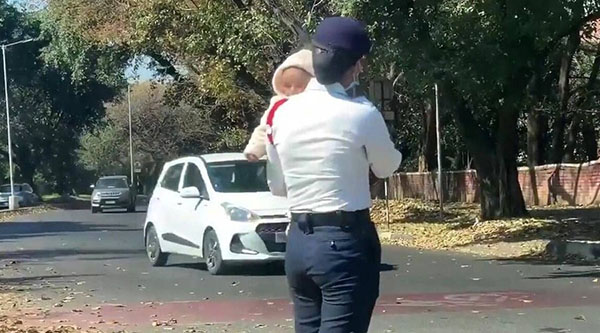 இந்தியாவின் சண்டிகரில் பெ ண் போக்குவரத்து போலீஸ் ஒருவர் கை குழந்தையுடன் பணி செய்த வீடியோ இணையத்தில் வைரலானது.
