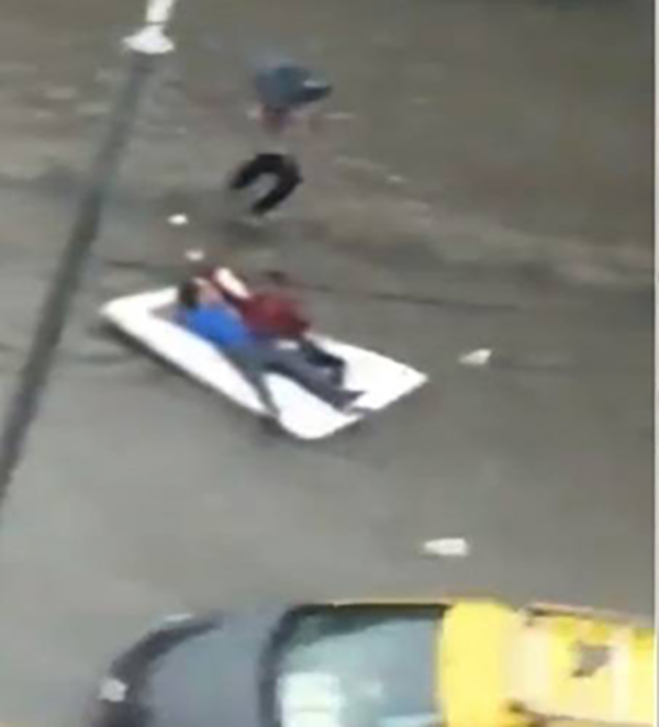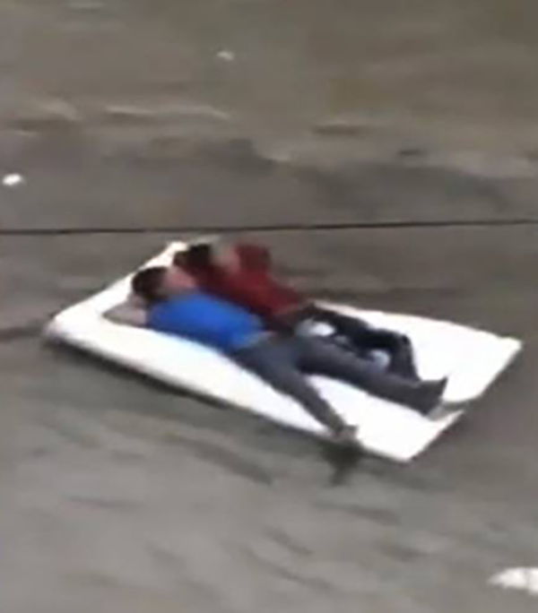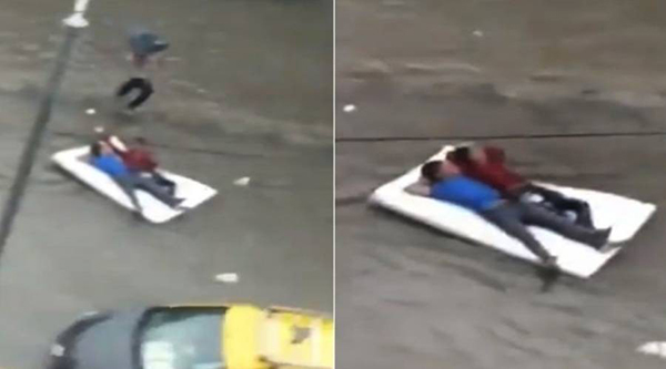 அது என்னவென்றால், சாலையில் பெருக்கெடுத்து ஓடும் தண்ணீரில் மிதக்கும் வகையிலான படுக்கை ஒன்றில் இளைஞர்கள் இருவர் படுத்துக்கொண்டு,ஒருவருடன் ஒருவர் ஜாலியாக பேசிக்கொண்டு சாலையில் மிதந்து செல்கின்றனர்.