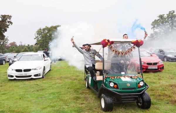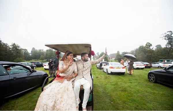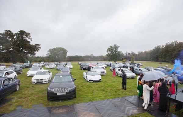 கொரோனா தொற்றுநோய் விதிமுறைகள், கட்டுப்பாடுகள், காரணமாக லண்டன் எசெக்ஸில் 500 ஏக்கர் தோட்டத்தில் நடைபெற்ற இந்த துர்மணத்தை 250 விருந்தினர்கள் கார்களில் இருந்து பார்த்தார்கள்.