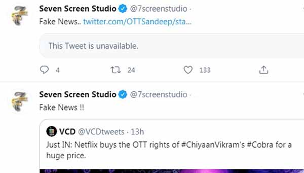 விக்ரம் நடிக்கும் கோப்ரா திரைப்படத்தின் ஓடிடி உரிமத்தை பிரபல ஓடிடி தளம் வாங்கி இருப்பதாக வெளியான செய்திக்கு தயாரிப்பு நிறுவனம் விளக்கம் அளித்துள்ளது.