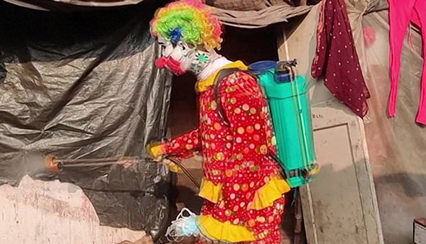 மும்பையில் கொரோனா தொற்று குறித்து விழிப்புணர்வு ஏற்படுத்தும் விதமாக இ.ளை.ஞர் ஒருவர் கோமாளி போல் வேடமணிந்து கு.டி.சை பகுதிகளில் கி.ருமி நாசினி தெளித்து வருகிறார்.