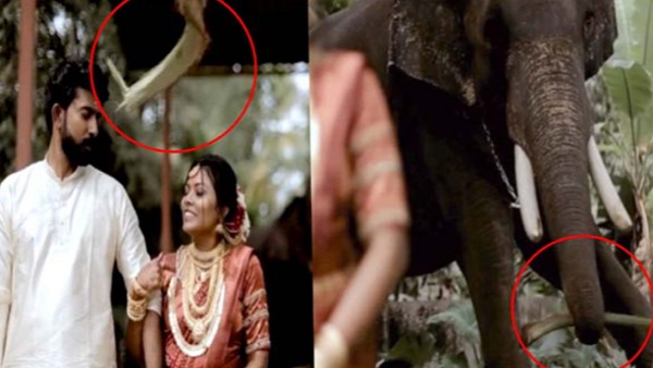 அந்த சமயத்தில், பின்னால் தொழுவம் ஒன்றில் யானை நிற்க அதன் முன்பு நிற்கும் ஜோடி, பல விதமான போஸ்களையும் கொடுத்து கொண்டிருந்தனர். அந்த ஒரு சமயத்தில் தான், யாரும் எதிர்பாராத விதமான ஒரு சம்பவம் அங்கே அரங்கேறி உள்ளது.