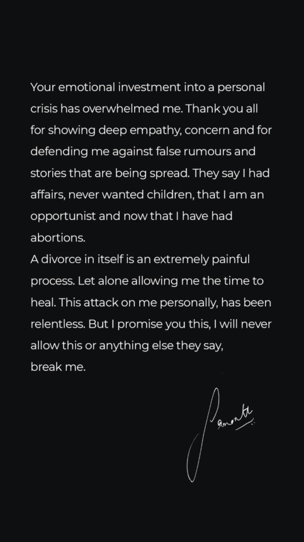 அதன்படி சமந்தா கூறியுள்ளதாவது, “எனது திருமண உறவு விவாகரத்தில் முடிந்தது குறித்து என் மீது அக்கறை காட்டும் அதே நேரத்தில் உண்மைக்கு மாறான பொய்யான கட்டுக்கதைகளும் பரப்பப்பட்டு வருகிறது. அந்த வதந்திகளுக்கு எதிராக என்னை பாதுகாக்க என் மீது அக்கறை காட்டிய அனைவருக்கும் நன்றி. எனக்கு வேறு ஒருவருடன் தொடர்பு இருந்தது, நான் குழந்தை பெற்று தர மறுத்தேன், நான் ஒரு சந்தர்ப்பவாதி மற்றும் கருவை கலைத்தேன் என பல வதந்திகள் வந்தன.