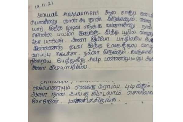 தனது தாய், சித்தப்பா, மாமா ஆகியோரை மிகவும் பிடிக்கும், யாருக்கிட்டயும் சொல்லாம போகிறேன்,என்னை மன்னித்து விடுங்கள், இனி எந்த ஒரு பெண்ணும் தன்னை போன்று சாகக் கூடாது என்று அதில் குறிப்பிட்டுள்ளார்.