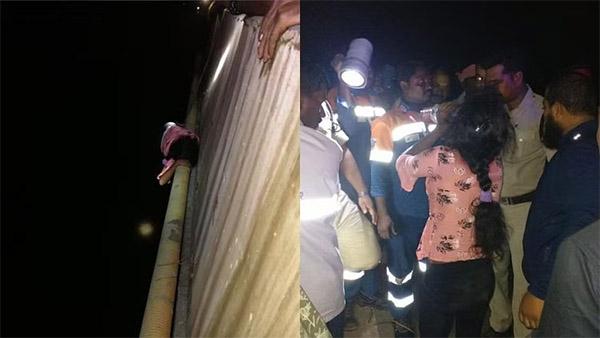 பின்னர் சிறுமி இருக்கும் இடமான கோதாவரி ஆற்றின் மேல் இருக்கும் பாலத்தில் தேடினர். அப்போது சிறுமி அந்த பாலத்தில் பிளாஸ்டிக் பைப் ஒன்றை பிடித்தவாறு தொங்கி கொண்டிருந்தார். இதனைக் கண்டதும் அதிர்ந்துபோன போலிசார் உடனடியாக சிறுமியை பத்திரமாக மீட்டனர். தொடர்ந்து சிறுமிக்கு மருத்துவ பரிசோதனை மேற்கொள்ளப்பட்டது.