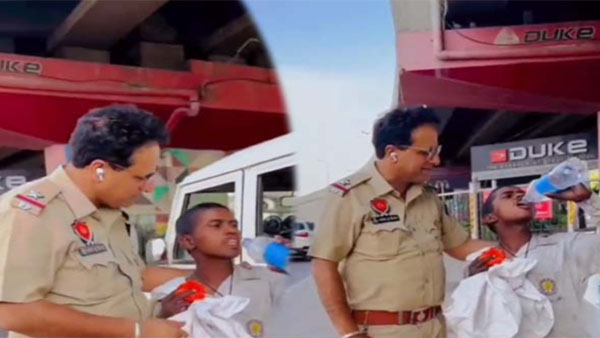 ஆம் கஷ்டப்பட்ட சிறுவன் ஒருவனின் தாகத்தை தணித்த காவலர் ஒருவர், அவனுக்கு புதிய செருப்பு மற்றும் ஆடைகளையும் வாங்கிக் கொடுத்து மகிழ்ச்சியடைய வைத்துள்ளார்.