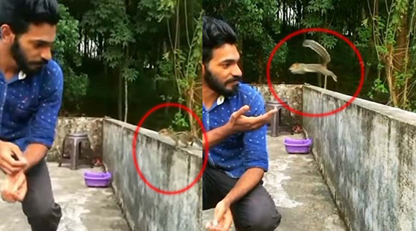 இளைஞர் ஒருவர் தன் வீட்டில் செல்லமாக அணில்குட்டியை வளர்த்து வந்த தோடு, அதற்கு பெயரும் வைத்துள்ளார். இந்நிலையில் தனது வீட்டு மொட்டைமாடி மதிலின் மேல் நின்று கொண்டிருந்த அணிலை வா என்பது போல் அந்த வாலிபர் சைகை செய்து கூப்பிட்டார்.