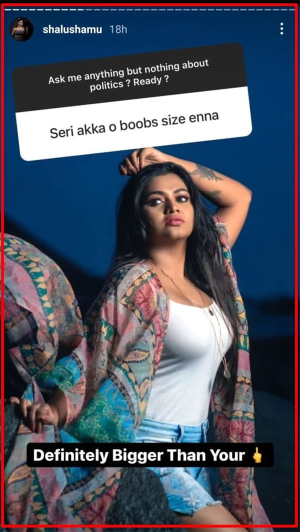 சோசியல் மீடியாவில் ரசிகர்களிடம் கலந்துரையாடிய ஷாலு ஷம்முவிடம் நெட்டிசன் ஒருவர், அக்கா உங்க மார்பகம் சைஸ் எவ்ளோ? என்று கேட்டார். அதற்கு பதில் அளித்த ஷாலு ஷம்மு உங்கிட்ட இருக்கிறத விட பெருசு தான் என்று பதிலடி கொடுத்துள்ளார்.