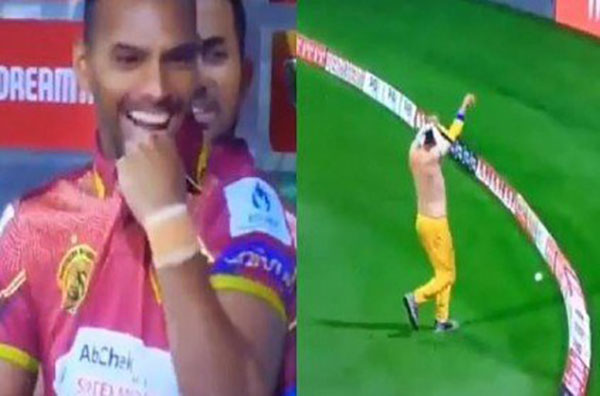 ஜெர்சியை அணிந்து கொ ண் டிருந்ததால் பவுண்டரியில் பந்தை கோட்டை விட்ட வீரர்! சிரித்த ரசிகர்கள்… வைரலாகும் வீடியோ!!