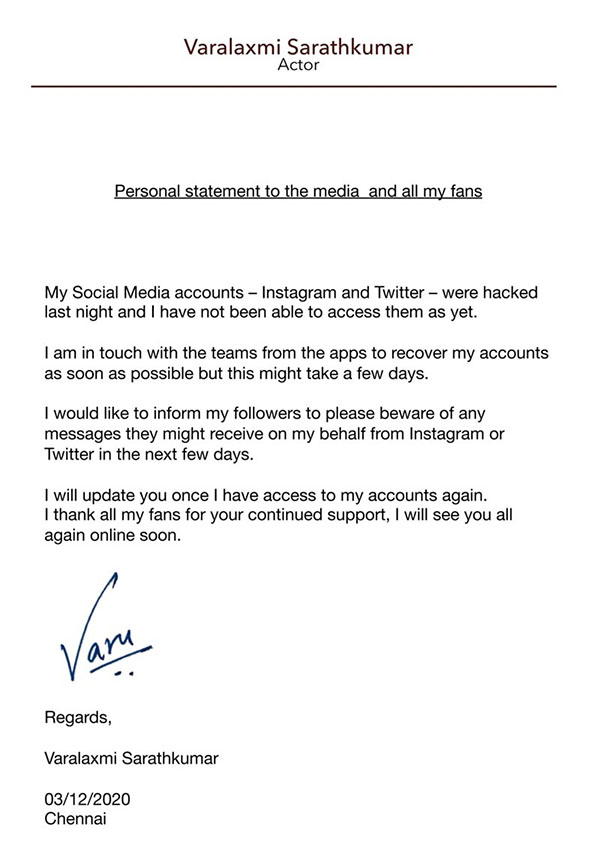 எனவே இன்னும் சில தினங்களுக்கு எனது கணக்கில் இருந்து வரும் பதிவுகளுக்கு ரசிகர்கள் யாரும் பதில் அளிக்க வேண்டாம் என்று கேட்டுக் கொள்கிறேன். எனது டுவிட்டர் மற்றும் இன்ஸ்டாகிராம் கணக்குகள் மீட்கப்பட்டவுடன் ரசிகர்களுக்கு தகவல் அளிக்கின்றேன். எனக்கு ஆதரவளித்த அனைத்து ரசிகர்களுக்கும் நன்றி’ என வரலட்சுமி சரத்குமார் தனது அறிக்கையில் கூறியுள்ளார்