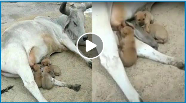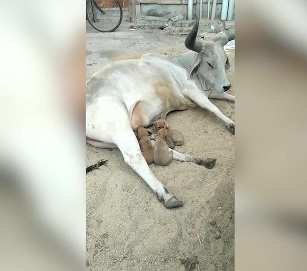 இந்நிலையில் குட்டி நாய்களுக்கு பசு தாயாக மாறி பால் கொடுத்துள்ளது.