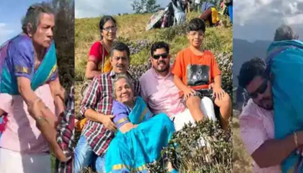 அதன்படி தங்களது வீட்டிலிருந்து இடுக்கி மாவட்ட கள்ளிப்பாறைக்கு ஜீப் மூலம் சென்ற அவர்கள், அங்கிருந்து மேலே சுமார் 1.5 கிமீ தூரத்திற்கு தனது தாயாரை தோளில் சுமந்து சென்றுள்ளனர்.