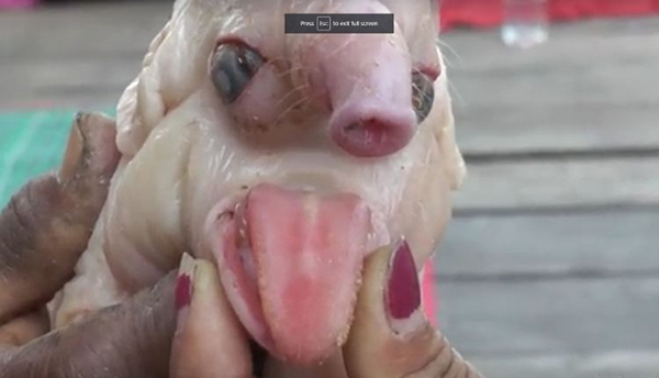 மூன்று பன்றிக்குட்டிகள் இயல்பாக பிறந்த நிலையில், கடைசி பன்றிக்குட்டி மட்டும், து தி க்கை போன்ற மூக்கு, பெரிய காதுகள், பெரிய கண்கள் மற்றும் நீண்ட நாக்குடன் பிறந்தது.