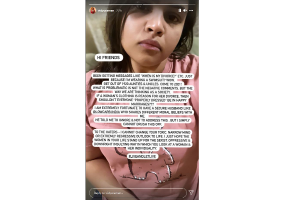 பெண்களுக்கு ஆடையால் விவாகரத்து நடக்கும் என நினைத்து கொண்டிருக்கும் 1921ஐ சேர்ந்த ஆண்டிஸ் மற்றும் அங்குள்ஸ் வெளியே போங்கள் என்றும், உங்களின் நச்சுத்தன்மையான கருத்திற்காகவோ உங்களின் குறுகிய எண்ணம் கொண்டவர்களுக்காக என்னை மாற்றிக்கொள்ள முடியாது , வாழு வாழ விடு என்று கூறியுள்ளார்.