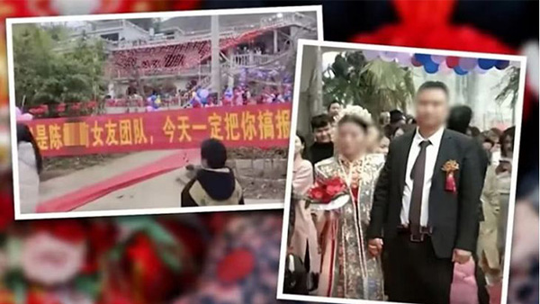 சீனாவின் யுனான் மாகாணத்தைச் சேர்ந்தவர் சென். இவருக்கும், அந்த பகுதியை சேர்ந்த இளம்பெண் ஒருவருக்கும் கடந்த பிப்ரவரி 5 ஆம் தேதி திருமணம் ஏற்பாடு செய்யப்பட்டிருந்தது. இந்த ஏற்பாடுகள் மிகவும் பிரம்மாண்டமாக நடைபெற்றுள்ளது. திருமணம் செய்துகொள்ள மணமகன் மற்றும் மணமகள் தயார் நிலையில் இருந்துள்ளனர்.