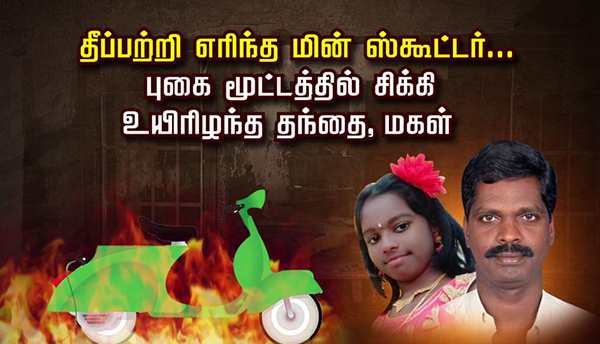 தீப்பற்றி எரிந்த மின் ஸ்கூட்டர்… புகை மூட்டத்தில் சிக்கி உயிரிழந்த தந்தை, மகள்!!
