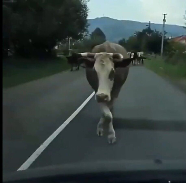 வீடியோவில், அந்த பசு கேமராவை நெ ருங் கும்போது, அதன் பின்னணியில் மேலும் பல ப சுக்கள் ந டந்து வந்துகொண்டிருக்கின்றன.